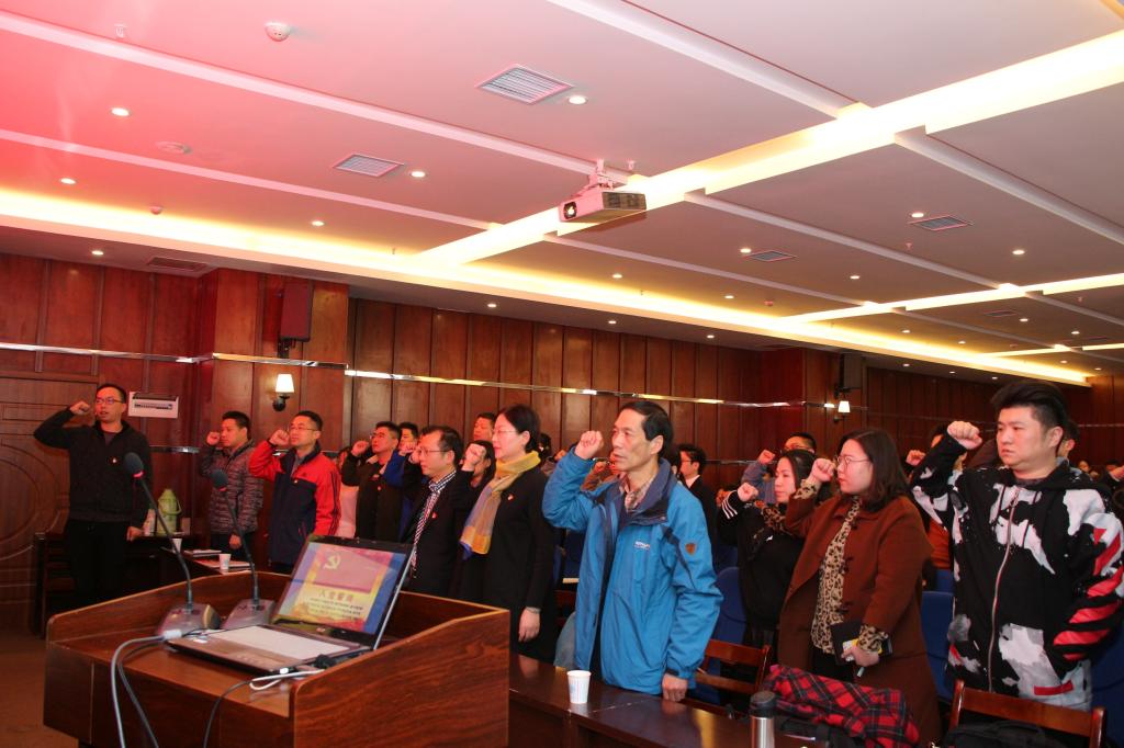 会上,全体师生起立奏唱国歌,全体党员重温入党誓词。
