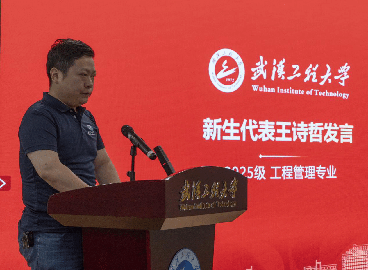 新生代表、工程管理专业的王诗哲同学结合自身在武汉检安石化工程有限公司多年工程电气领域的实践经历,表达了对未来学习的期待与规划。他表示将科学规划时间、主动向导师和同学学习,并努力做到学以致用,力争成长为既懂技术又善管理的复合型人才。