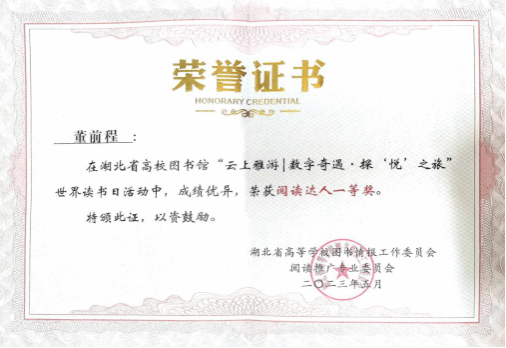 (通讯员 胡旗)日前,由湖北省高等公司图书情报工作委员会主办的湖北省高校图书馆“云上雅游|数字奇遇·探‘悦’之旅”世界读书日活动公布获奖结果,Beats365唯一官网入口2020级动画专业董前程同学在众多选手中脱颖而出,喜获阅读达人一等奖。