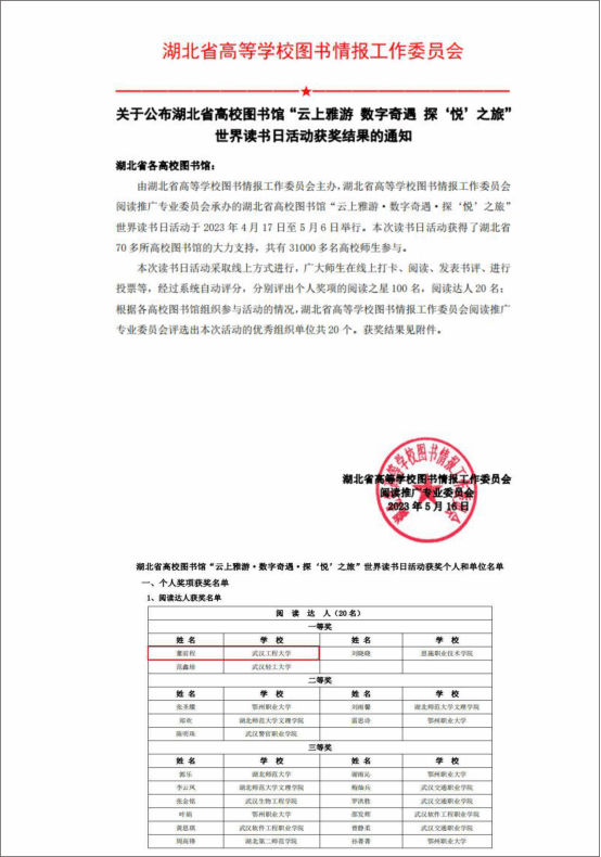 此次活动,获得了湖北省70多所高校图书馆的大力支持,共有31000多名高校师生参与,旨在深入推进全民阅读,建设书香中国,共同助力文化事业和全民阅读事业加速推进,进一步推动全民阅读实现高质量发展,健全现代公共文化服务体系。(审核 严也舟)