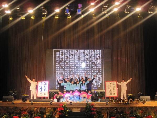 晚会在计算机教学点带来的开场舞《桃夭》中拉开了帷幕,西北教学区表演的热情洋溢的啦啦操《show girl》更是点燃了现场观众的激情。卓刀泉校区舞蹈《青花瓷》、傣族舞蹈《是你给我爱》,管理公司教学点的流行歌曲串唱,吴家湾校区的乐队表演和舞蹈《幸福万年长》等精彩的节目赢得了观众的一阵又一阵掌声,现场气氛异常热烈。法商公司教学点的诗朗诵《玉树——会呼吸的痛》则反映了对玉树地震遇难同胞的悼念,为地震灾区同胞祈福。晚会的最大亮点是西北区同学表演的《古之韵》,演员们身着五四青年服,在梁启超的《少年中国说》中,常旭和马运徽同学现场泼墨,一挥而就写成“美哉,我少年中国与天不老。壮哉,我中国少年与国无疆”,笔法遒劲展现了中华民族书法艺术的魅力。最后,晚会在歌曲《和谐中国》中圆满落下帷幕。