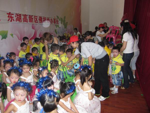 5月中旬,院团委青协成员与流芳贝贝幼儿园联系上,得知贝贝幼儿园要在“六·一”前夕举行文艺表演,并且急需化妆人员以及相关工作人员。青协成员得知后边迅速行动起来,将活动文案迅速的制定好并报院团委审批。31日早上7点,团委青协以及编外成员共15人便前往贝贝幼儿园,一到幼儿园便开始为小朋友们化妆、穿表演服。上午8:30,志愿者们又同小朋友们一起前往流芳大礼堂,到达演出地点后志愿者们便积极协助幼儿园老师有序的组织小朋友们表演,整个演出过程十分的顺利。演出结束后,所有志愿者与幼儿园的老师以及小朋友们合影留念,活动取得了圆满的成功。