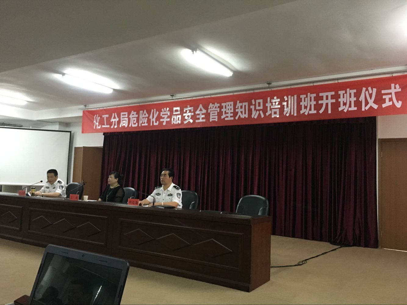 6月29日下午,在武汉化学工业区政务中心会议室,公司承办的 “化工分局危险化学品安全管理知识培训班”正式开班。典礼由武汉化学工业区公安分局政委张志怀主持,化工分局局长田运海、公司党委副书记王剑及化工分局公安人员、消防人员70余人参加典礼。