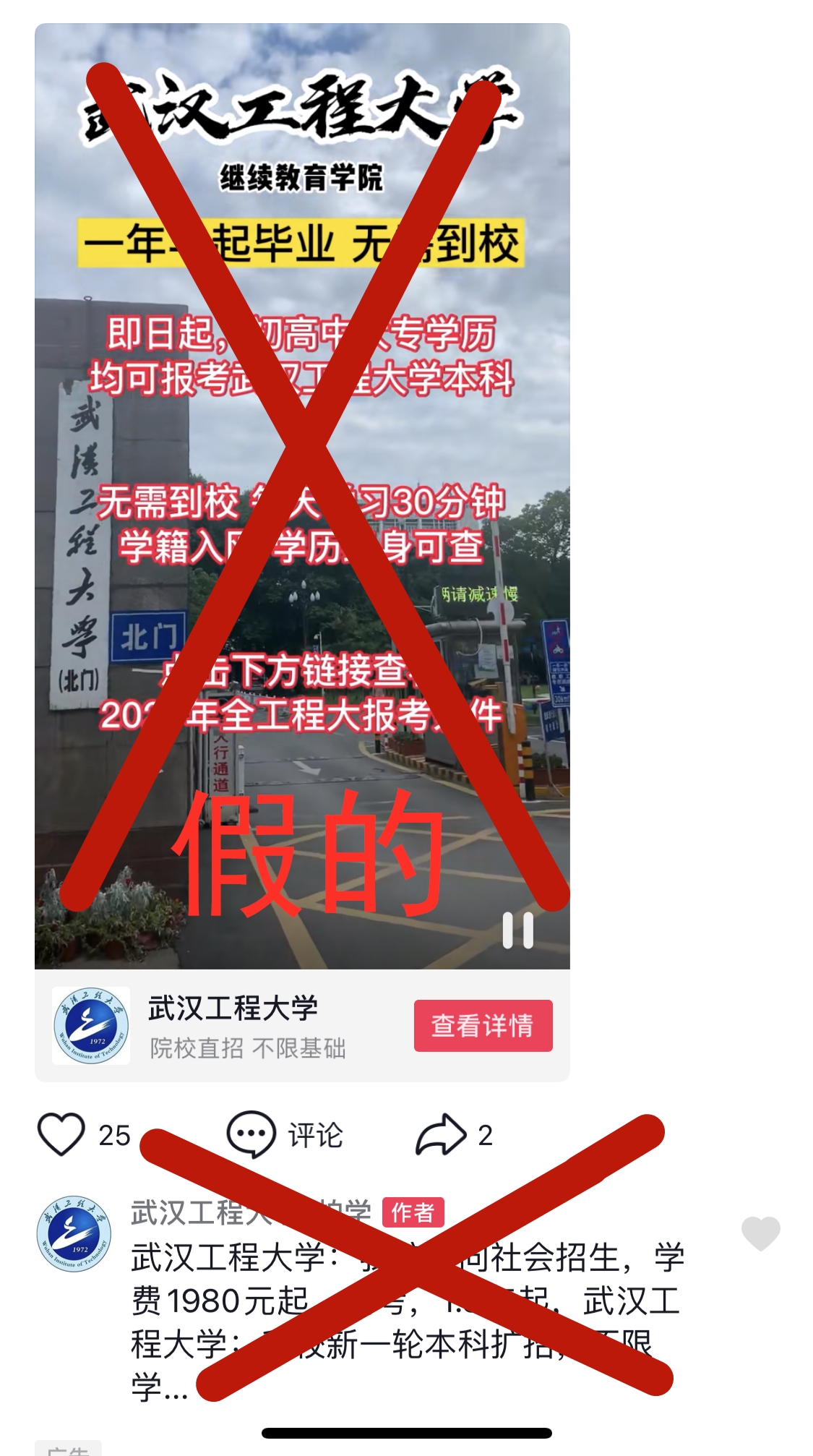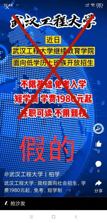 冒用公司名义在抖音等互联网媒介上进行虚假招生宣传示例,非公司正确招生宣传咨询通道,请广大考生提高警惕!!!